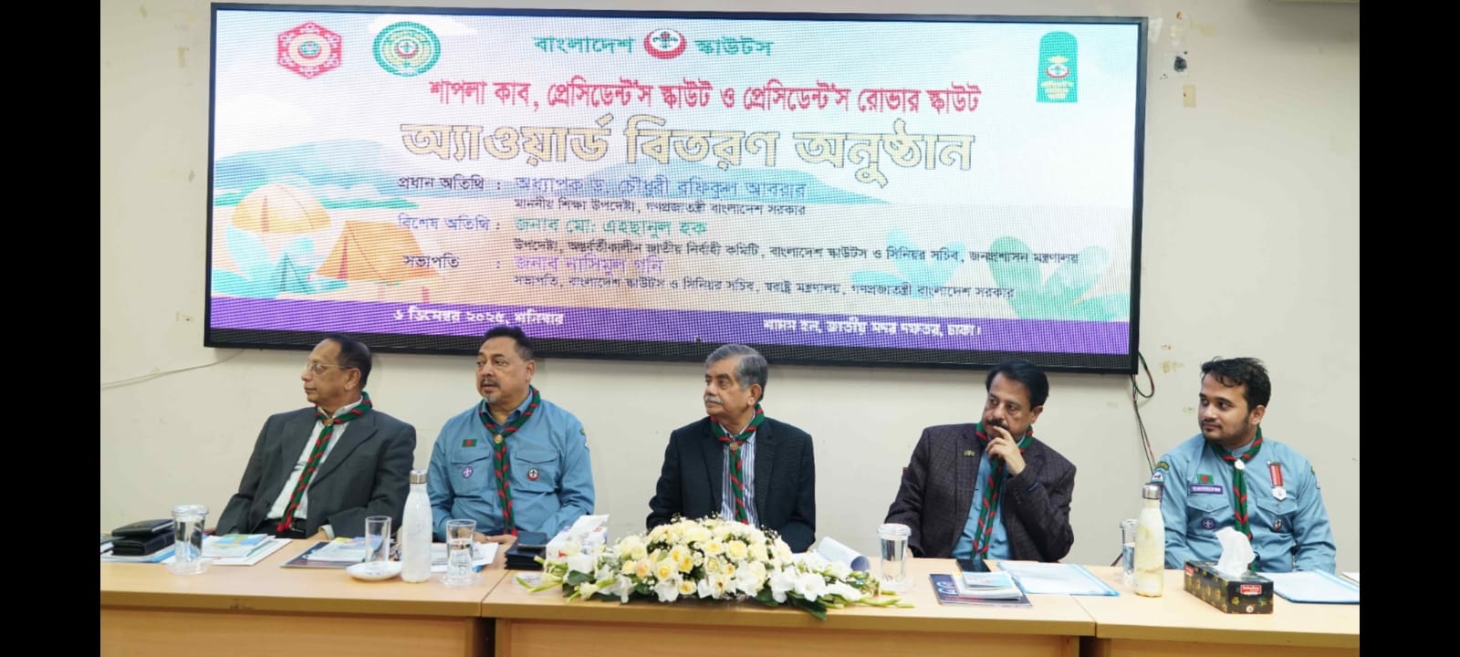 শনিবার ৬ ডিসেম্বর ২০২৫ সকালে বাংলাদেশ স্কাউটসের জাতীয় সদর দফতর, শামস হলে বাংলাদেশ স্কাউটস প্রোগ্রাম বিভাগ আয়োজিত এক জমকালো অনুষ্ঠানে ১৯৭ জন কাব স্কাউট, স্কাউট ও রোভার স্কাউটকে দেয়া হয়েছে শাপলা কাব, প্রেসিডেন্ট’স স্কাউট এবং প্রেসিডেন্ট’স রোভার স্কাউট অ্যাওয়ার্ড।